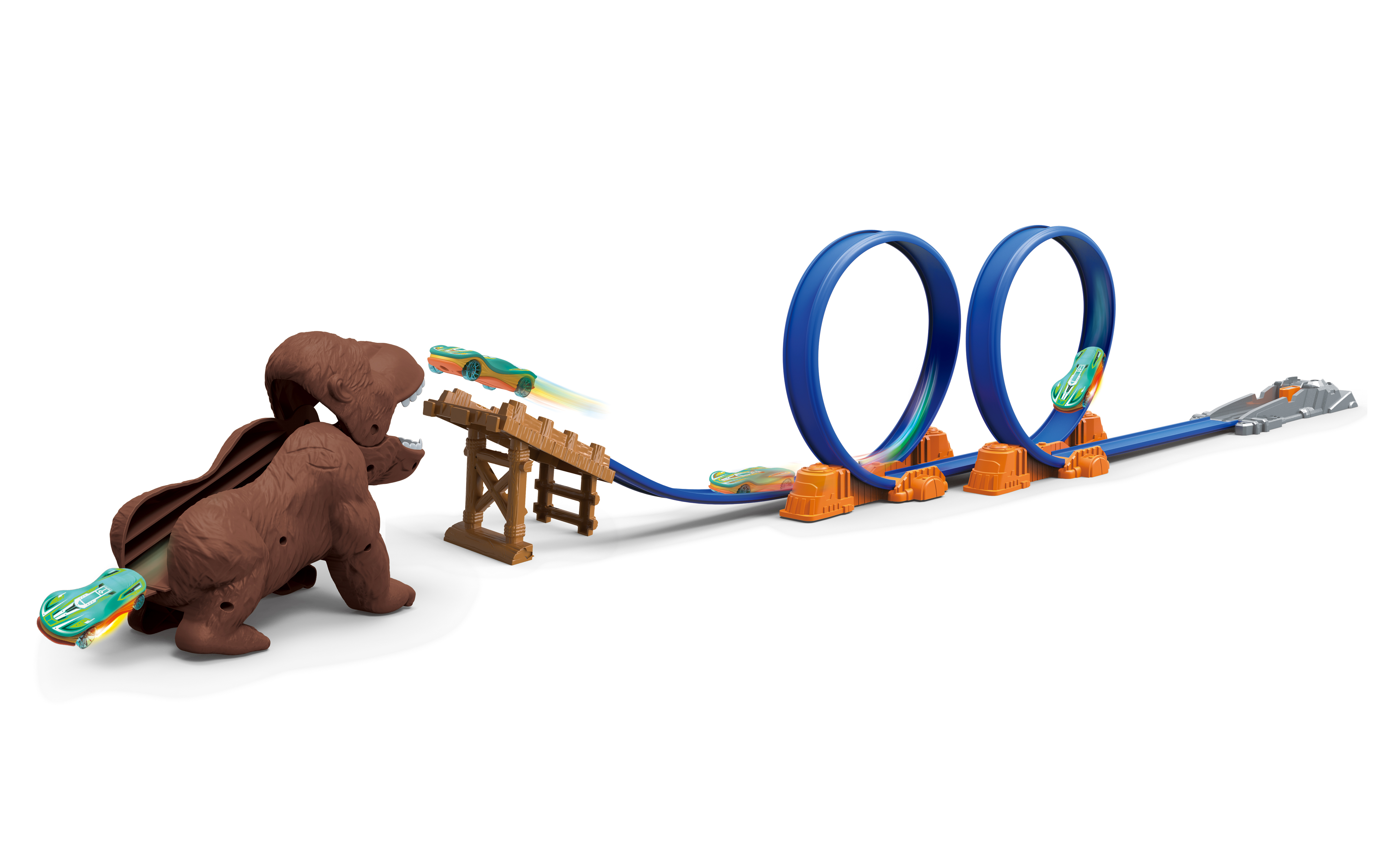 Vystřelovací dráha Orangutan 165 cm 1 auto. Rozměry dráhy. 165 x 20 x 13 cm. Dráha obsahuje 2 smyčky, vystřelovací plošinu, skokanský můstek, překážku orangutan s otevírací tlamou, autíčko 7,5 cm. číst celé