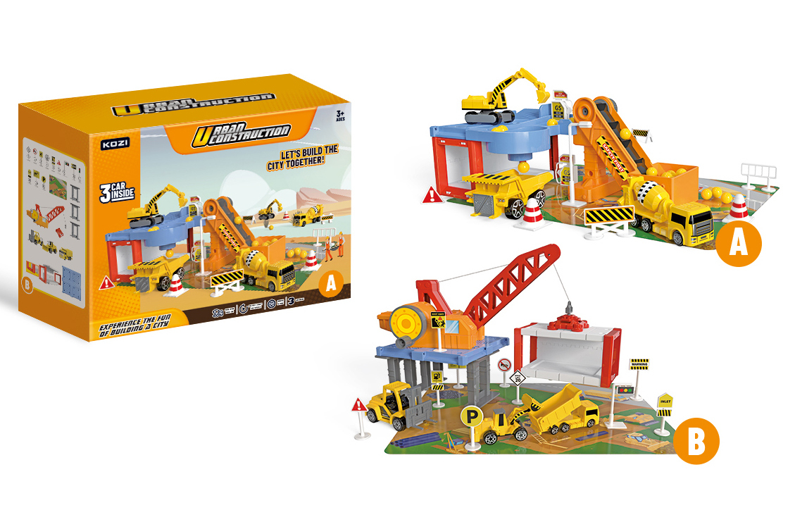 - Obsahuje: garáž, sklápěč, bagr, domíchávač, přepravní pás, značky
