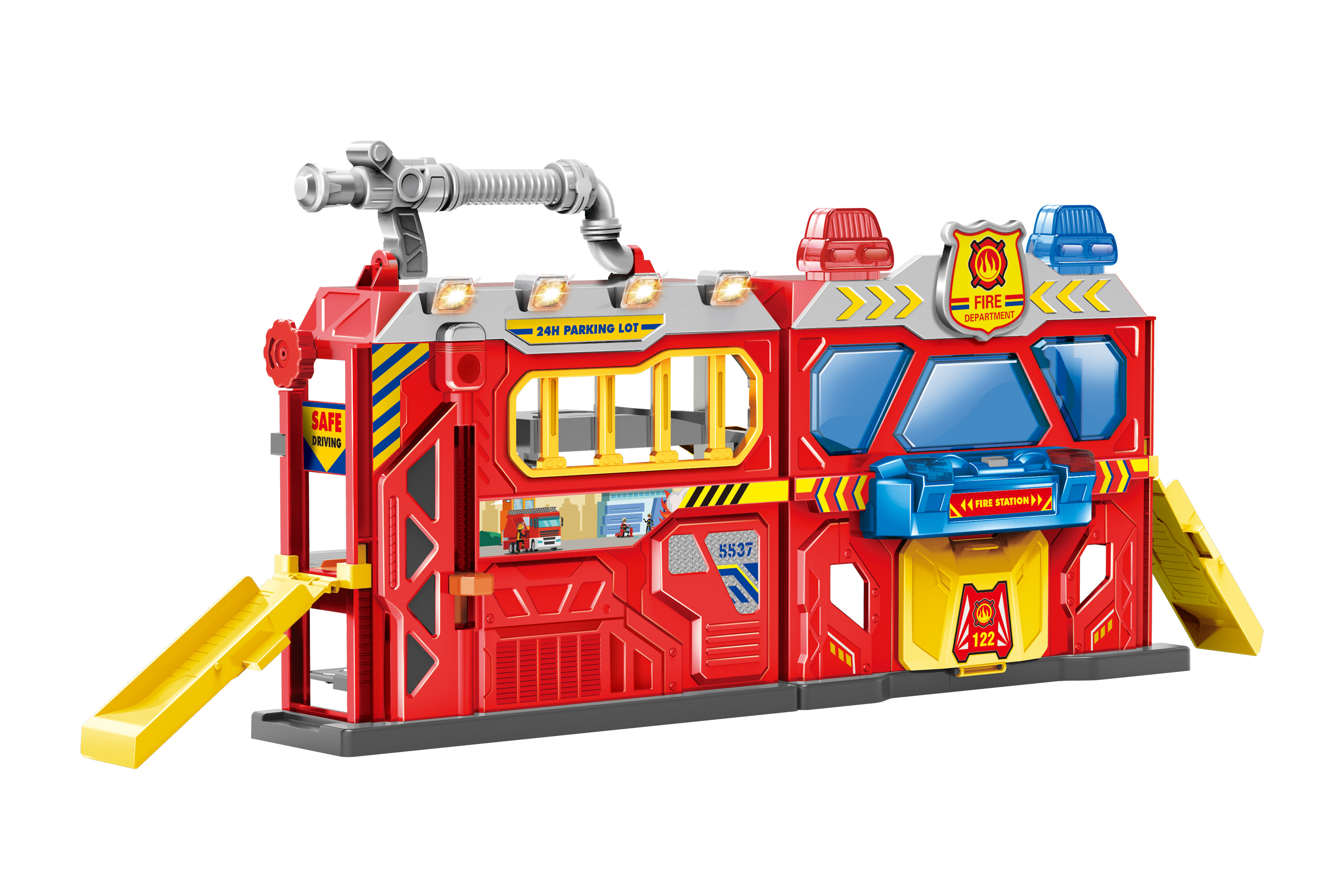 Hasičská stanice přenosná. Rozměry 56x18x23 cm. Světelné a zvukové efekty. Aktivace tlačítkem na modrém panelu. 3xAG13 baterie součástí. Součástí 2 auta s volnými koly, mnoho příslušenství (dopravní značky, hasičský přístroj, myčka, čerpací stanice, diagnostika a další). číst celé