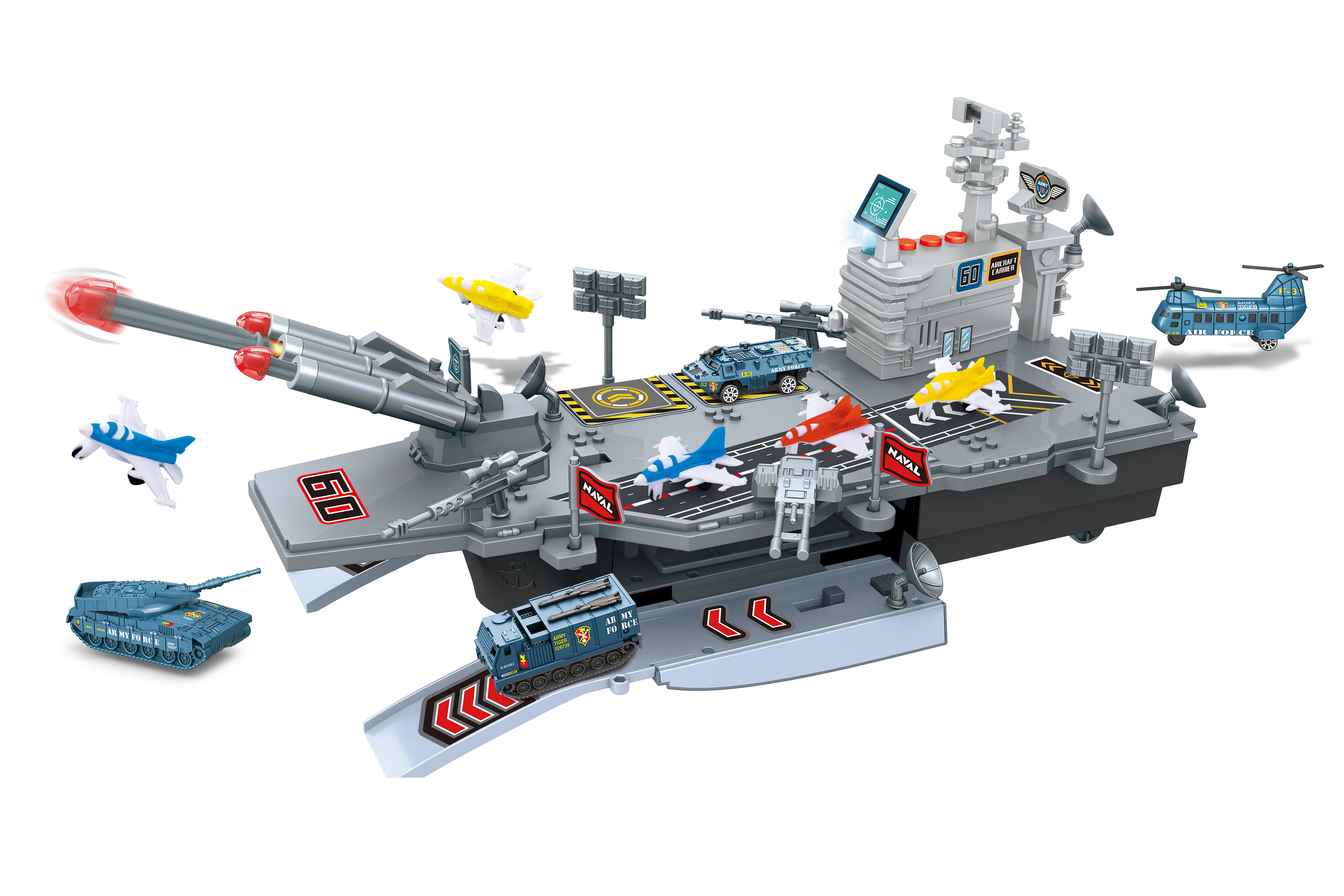 Loď letadlová bitevní s efekty. Délka 40 cm. Balení obsahuje loď, několik stíhaček a aut. Část lodi je třeba složit. Přihrádka na baterie se nachází na straně velící věže s tlačítky. Tlačítky se aktivují světelné a zvukové efekty střelby. Loď je možné otevřít, na straně lodi je možné připojit rampy. 3 kanóny - vystřelovací šipky. Balení obsahuje také samolepky k polepení lodi. Baterie 2xAA nejsou součástí.