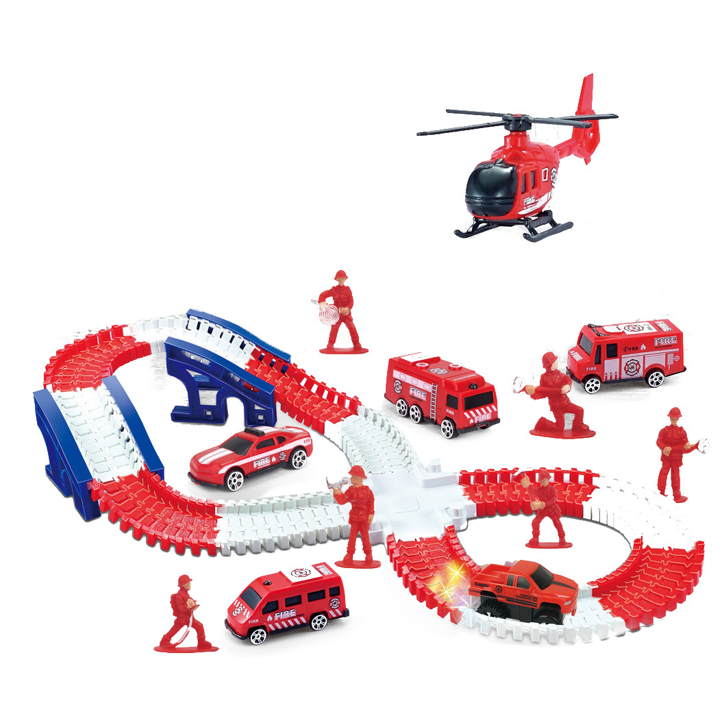 Magická dráha s LED autem. Spojením dílků si postav svoji velkou dráhu! Součástí je také hasičské terénní auto, které má 1 LED světlo (vyžaduje 1x baterii typu AA, která není součástí balení). Sada obsahuje celkem pět požárních aut, jeden vrtulník a 143 ks dráhy ve třech barvách.