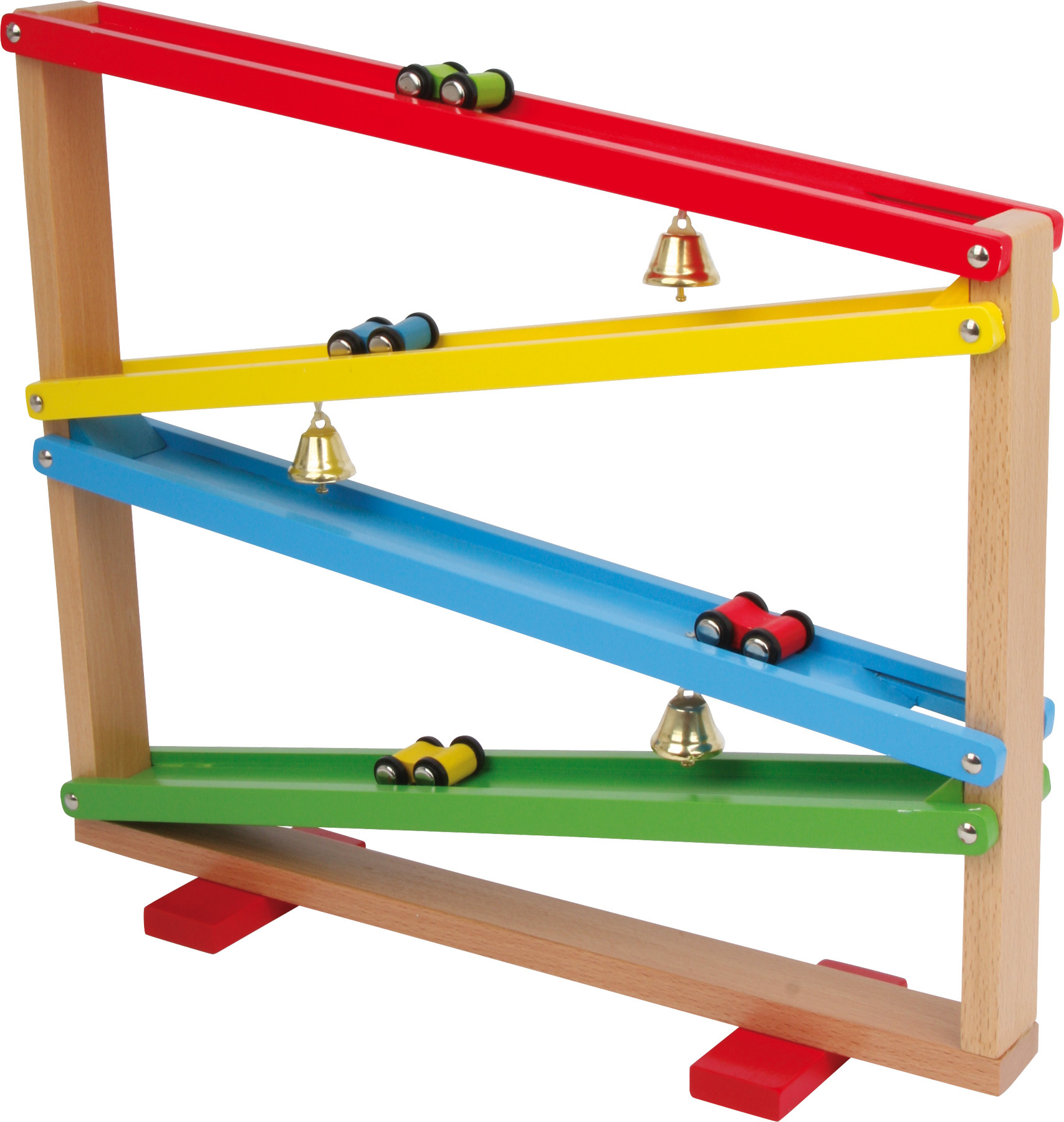 Krásná a barevná zvonková dráha s 4 autíčky, které při zdoláván dráhy rozezvučí zvonečky v každém patře dráhy.