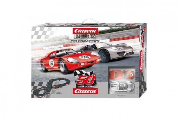 Autodráha Carrera Evolution Celebracers 50. výročí je dlouhá 5,3 m a s auty Porsche 904 Carrera GTS a Porsche 918 Spyder udělá radost každému fanouškovi závodů. Obsahuje rovinky, zatáčky, bezdrátové ovladače, přemostění, díl na předjíždění na rovince, napájecí díl a další díly.