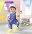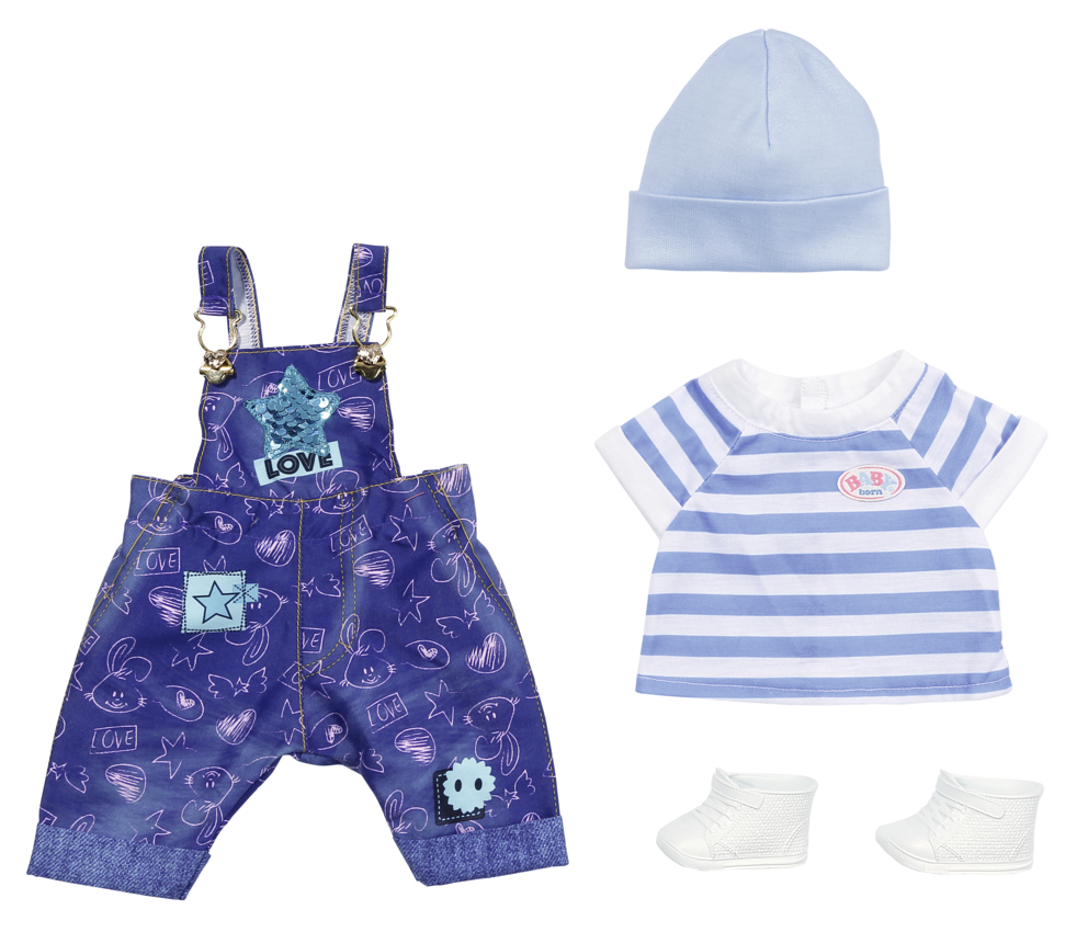 V džínách s laclem to chlapečkovi BABY born obzvláště sluší. Kalhoty jsou ozdobeny roztomilým potiskem a krásnými knoflíky ve tvaru srdíček. Když pohladíte flitrovou hvězdičku, změní barvu z tyrkysové na bronzovou. Kalhoty jsou perfektně sladěny s modro-bíle pruhovaným tričkem, světle modrou čepičkou a bílými teniskami. • Originální obleček pro panenky BABY born. • Pro nápaditou, rozmanitou a dlouhotrvající hru. BABY born Džíny s laclem pro panenky ve velikosti 43 cm. Součástí jsou kalhoty, tričko, čepice, a botičky.