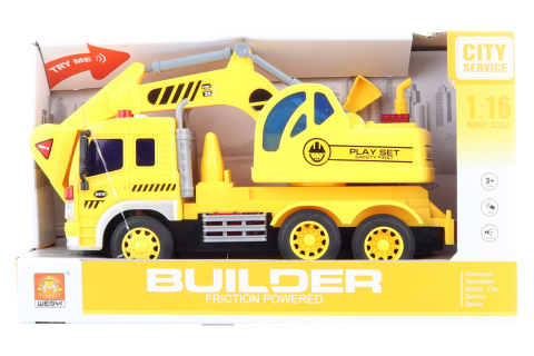 Plastový kamion s bagrem na baterie. Po stisknutí tlačítek vydává zvuky a svítí. Napájení 3x AG13/LR44 baterie - jsou součástí balení. Rozměr balení cca 32,5 x 19 x 12 cm. Věk 3+ číst celé