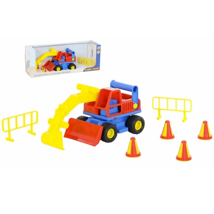 Bagr ConsTruck s pneumatikami, všechny části jsou pohyblivé s možností mechanické manipulace. Součástí balení jsou i 4 kužely a 2ks silniční zábrany.Hračka je certifikována pro děti od 1 roku věku od renomované značky Wader quality toys. Barevné kombinace konzultujte dle aktuálního stavu na skladě.