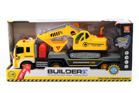 Sada obsahuje 2 auta. Velký tahač po stisknutí 4 tlačítek na kapotě vydává zvuky a svítí. Rozměr tahače cca 38 x 10 + sklopná plošina. Rozměr balení cca 42 x 19 x 11,5 cm. Měřítko 1:16. Napájení na knoflíkové baterie (součástí balení). Věk 3+ číst celé