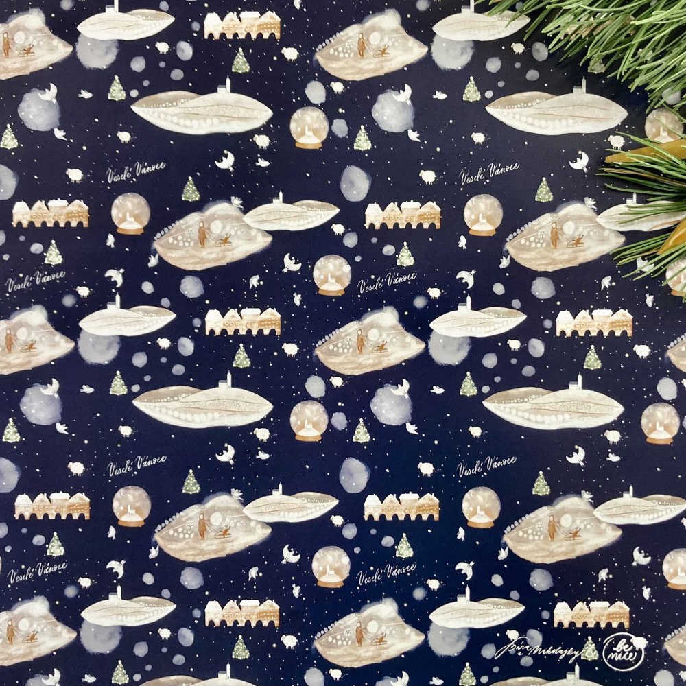 Vánoční balicí papír Nebeská procházka ilustrovala česká výtvarnice Bára z Nikolajky. Ilustrace byly vytvořeny technikou akvarelu a kreslení.