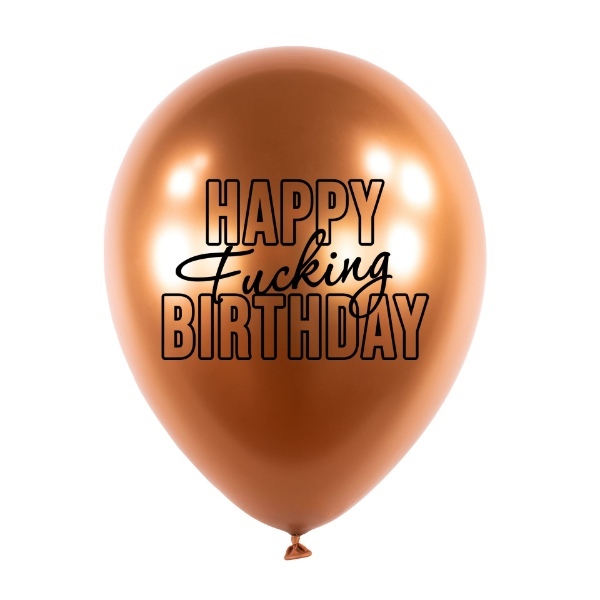 Sada chromových balonků s potiskem Happy Fu.king Birthday v měděné barvě v jantarovém odstínu. Balonky se díky svému nápisu hodí na vtipnou oslavu narozenin pro dospělého. Balení obsahuje 5 kusů potištěných 30 cm balonků, které jsou vhodné na nafukování heliem i vzduchem. Barva: jantarováObsah balení: 5 x latexový chromový balonek s potiskemObjem celého buketu: cca 80 lObjem 1 ks balonku: cca 16 lNafukování: vzduch nebo héliumVýdrž hélia v latexovém balónku bez ošetření gelem: 16 hod.Výdrž hélia v latexovém balónku po ošetření gelem: cca 3 dnyMateriál: LatexObchodní balení: AnoBalení: 1 ks