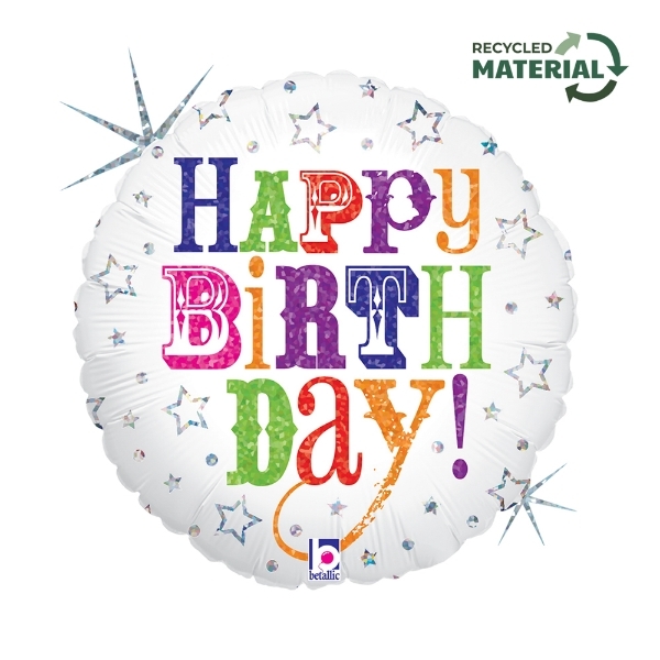 Jemný a zároveň výrazný - takový je tento kulatý fóliový balonek s barevným nápisem HAPPY BIRTHDAY, který září na bílém pozadí spolu s holografickými hvězdami. Skvěle se hodí k oslavám pro děti i dospělé, k moderním i veselým barevným aranžím.