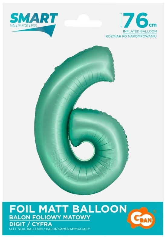 Balon foliowy Smart, Cyfra 6, miętowa matowa, 76 cm, GoDan