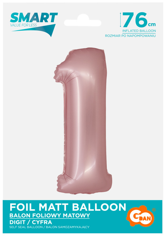 Balon foliowy Smart, Cyfra 1, j. różowa matowa, 76 cm, GoDan