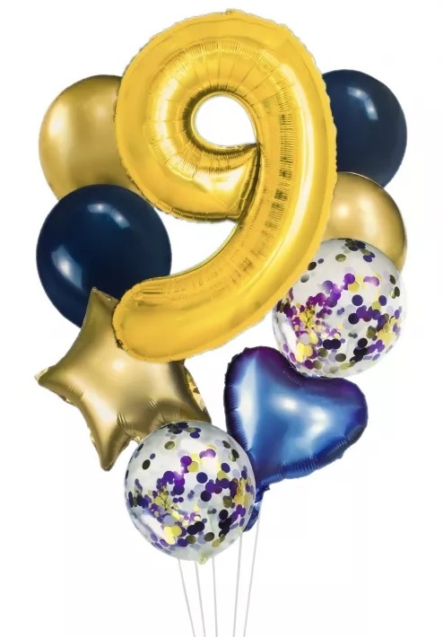 1 szt. cyfra balon foliowy 60 cm, 1 szt. Serce foliowe 46 cm, 1 szt. Gwiazda foliowa 46 cm, 6 szt. Lateksowy 40 cm, 1 szt. złota tasiemka cyfra 9 číst celé