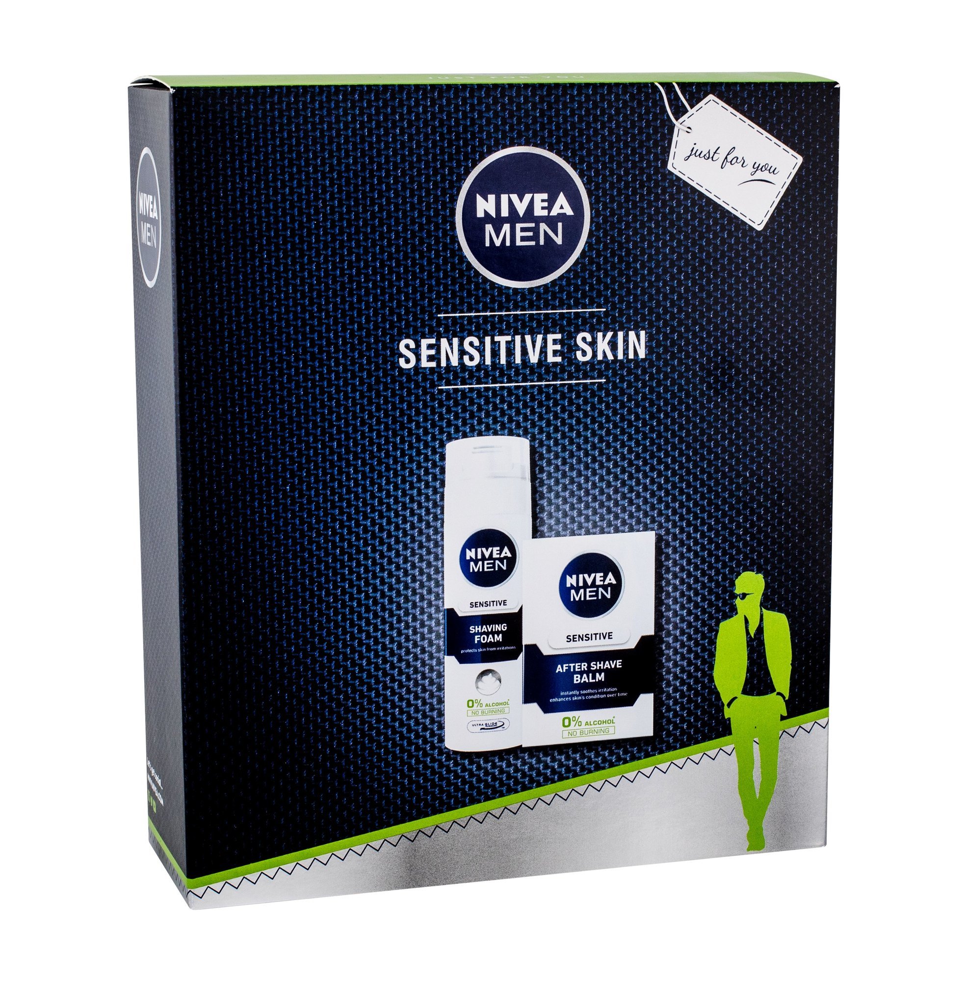 **Nivea Men Sensitive Shave Care** kazeta pro citlivou pokožku. **Složení kazety**: **Men Sensitive After Shave Balm 100ml - Balzám po holení** Extra šetrné a nemastné složení zmírňuje pocit pálení po holení. Díky obsahu zklidňujícího heřmánku a výtažku z hamamelis okamžitě zklidňuje podráždění. Nelepí a rychle se vstřebává. **Men Sensitive Shaving Foam 200ml - Pěna na holení** Složení s heřmánkem a vitamínem E obsahuje i výtažek z hamamelis. Nezpůsobuje pálení pleti po holení. Chrání pokožku před podrážděním.