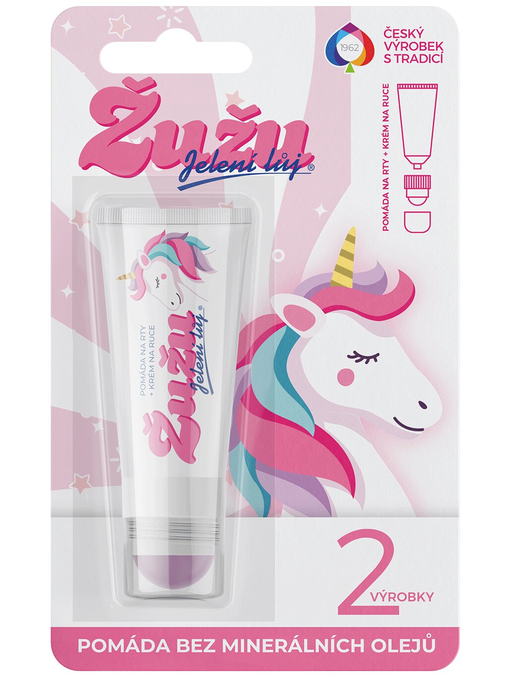 Jemnou strukturu a specifickou vůni Jeleního loje milují statisíce spokojených zákaznic a zákazníků, proto jsme ji použili jako základ pečující kosmetiky vhodné na rty i ruce. Obohatili jsme ji o malinovou vůni Žužu a vznikla tak sladká chvilka péče pro všechny generace.Díky unikátnímu řešení najdete v jednom balení dva druhy péče: