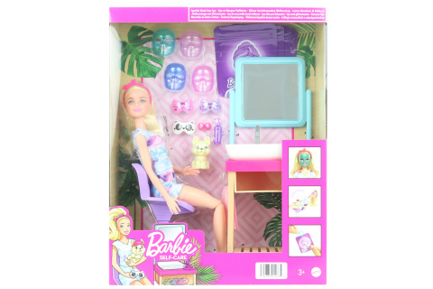 Prožijte s Barbie® Třpytivý relaxační den v lázních. Děti si s tímto herním setem mohou osvojit rituály hýčkání a relaxace. Součástí herního setu je blonďatá panenka Barbie® s pohyblivými klouby, figurka štěněte a více než 15 doplňků, s nimiž si můžete hrát na relaxační procedury. Balení obsahuje panenku Barbie, umyvadlo a zrcadlo, polohovací křeslo, ručník, 4 obličejové masky, 4 uzavíratelné sáčky, 3 oční masky se zvířecími motivy, lahvičku s krémem, pantofle a čelenku. Jakmile hra skončí, mohou děti uklidit masky do uzavíratelných sáčků s motivem Barbie® a hru opakovat. Rozměr balení cca 25,5 x 32,5 x 8,5 cm. Věk 3+