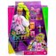 Tato panenka Barbie má make-up s hvězdičkami a extra dlouhé neonově zelené vlasy upravené do efektního stočeného culíku. Svůj sebevědomý styl předvádí v oversize tričku, černých šněrovacích legínách a divokém chlupatém boa. K doplňkům patří zábavná kabelka z krabice od cereálií, sluneční brýle s perlovými detaily, spousta třpytivých šperků a čelenka. Její domácí mazlíček je papoušek v slunečních brýlích ve tvaru srdce a rozkošným výrazem. Barbie Extra umožňuje dětem objevovat sebevyjádření prostřednictvím stylu a kreativity!
