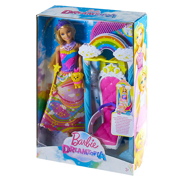 Panenka Barbie® může panovat svému Sladkému království z tohoto unikátního trůnu, který není jen obyčejným trůnem, ale skrývá i několik fantastických vychytávek. Jakmile si budeš chtít užít trochu zábavy a odpočinout si od panování, jednoduše použij trůn jako houpačku. Pestrobarevný trůn je ozdobený mnoha duhovými prvky a jeho součástí je i speciální klip, díky kterému panenka zůstane po celou dobu houpání na svém místě. Trůn v sobě ukrývá odnímatelný hřeben a součástí je i malý zvířecí kamarád.