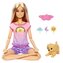 Děti mohou meditovat s panenkou Barbie® Meditace, která jim pomůže cítit se uvolněně během dne a usínat v noci. Tato plně polohovatelná panenka má 6 různých meditací se světelnými a zvukovými obrazci ve 2 různých režimech: Denní a noční. Stiskněte slunce na náhrdelníku panenky Barbie® a postupujte podle něj v režimu Denní pro klidné ranní probuzení, protažení a dechové cvičení. Stiskněte měsíc na náhrdelníku panenky a postupujte podle něj v režimu Noční pro uvolnění svalů, zklidnění před spánkem a usínání. K panence patří také maska na oči, štěňátko a 3 různé zasouvací emotikony, které dětem pomáhají poznávat jejich nálady. Panenka neumí stát samostatně. Barvy a provedení se mohou lišit. Pro děti od 3 let.