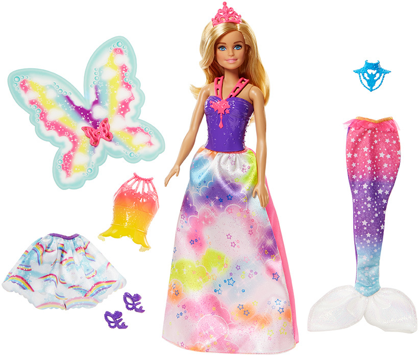 Užij si spoustu zábavy a vezmi panenku Barbie® za dobrodružstvím na zemi, na moři i ve vzduchu s tímto setem pohádkových oblečků. Když vstoupíš spolu se sestrami Barbie® a Chelsea™ do Dreamtopie, probudíš se ve světě, kde se sny stávají skutečností! V tomto setu na tebe čekají tři fantastické oblečky. Oblečky i doplňky jsou inspirovány Duhovým královstvím. Vyměňuj, kombinuj, slaďuj a vytvoř dokonalý obleček pro panenku Barbie®, který bude jako stvořený pro tvé příběhy.
