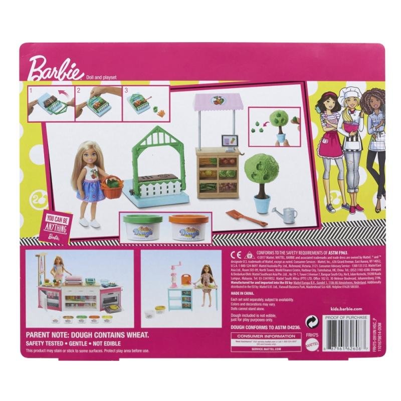 Přidej se k panence Chelsea™ a vypěstujte si společně svou vlastní zeleninu! V herním setu Chelsea zahradnice na tebe čeká panenka Chelsea™, jabloň s otvory na jablka, stánek se zeleninou, lis na hlínu, zahradnické náčiní a dvě těsta, každé v jiné barvě. Pojďme zahradničit! Vlož těsto do formiček ve tvaru mrkve a salátu, které se nachází v lisu. Zakryj je hlínou, zatáhni páčku dozadu a sleduj, jak se v zemi začnou objevovat plody tvé práce! V zahrádce si můžeš vypěstovat i ovoce, stačí se postarat o jabloň a vyrostou na ní dokonale tvarovaná jablíčka. Jakmile je čas sklizně, použij rýč a košík a pomoz panence Chelsea™ sesbírat všechno ovoce a zeleninu! Panenka Chelsea™ se na den na zahrádce oblékla do pohodlných letních šatiček a botek.