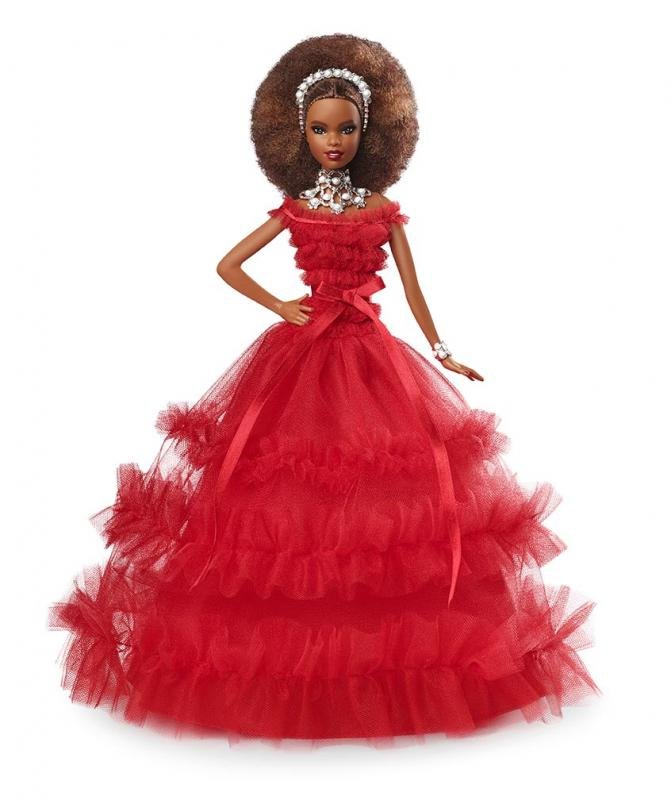 Překrásná Barbie™ panenka s afro účesem je oblečena do vícevrstvých rudých šatů, které doplnila bohatě zdobeným masivním náhrdelníkem, vlasovými doplňky a botkami. číst celé