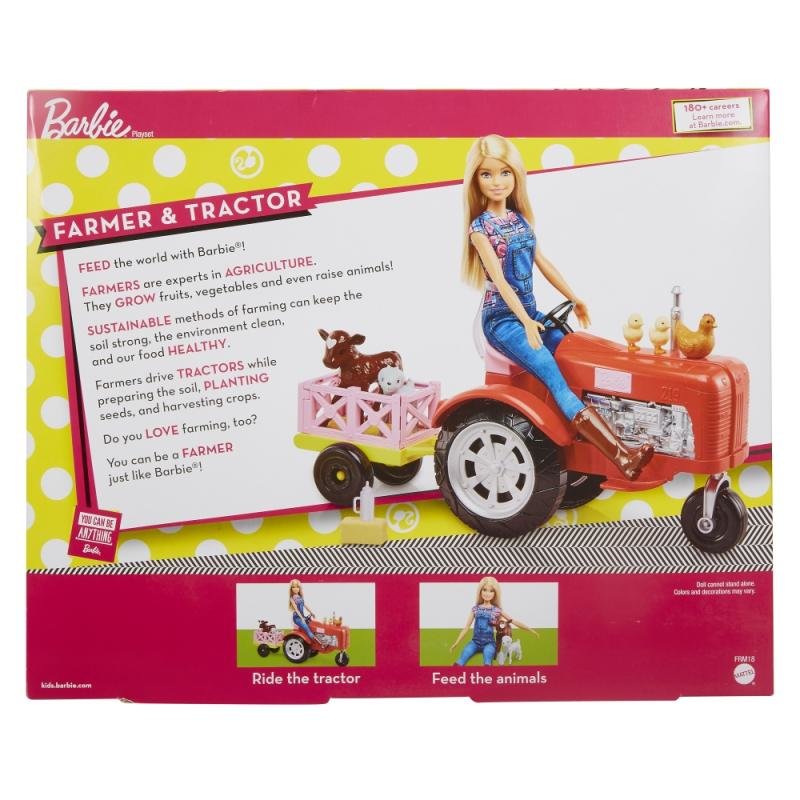 Sni ve velkém s panenkami Barbie® v povolání! Každá panenka je oblečena do tematického profesního oblečku a doplňků, které dodají tvým příběhům ty správné realistické detaily. Barbie® farmářka je oblečena do džínových montérek, pod které si vzala kostkovanou košili s knoflíky. Celý outfit podtrhují pracovní botky v typické růžové barvě. Panenka Barbie® je připravena se postarat o celou svou zvířecí rodinku: dvě kuřátka, kůzlátko, telátko a slepičku. Panenčiným velkým pomocníkem v péči o zvířátka je červený traktor s vozíkem. Podívej! Kola traktoru s vozíkem se skutečně otáčí! Otevři bok vozíku, nalož všechna zvířátka a vydejte se tam, kam vás tvá fantazie zavede!