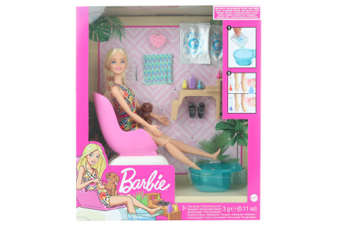 Panenka Barbie® ví, že je důležité o sebe pečovat. Připoj se k panence Barbie® a jejímu štěňátku a nechte se rozmazlovat v nehtovém studiu. Usaď panenku Barbie® do židle a ponoř její chodidla do vodní lázně. Naplň lázeň vodou a přidej jeden ze dvou šumivých sáčků. Co by to bylo za pedikúru bez lakování nehtů. Použij houbu a vodu a změň barvu jejích nehtů. Nezapomeň ani na nehty na rukou. Na dřevěné lavici najdeš všechny potřeby na manikúru a pedikúru a dokonce je tu i dostatek místa pro panenčino štěňátko. Panenka se při této příležitosti oblékla do pohodlného domácího oblečku a pohodlných botek. Věk 3+