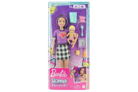 Malé děti mohou být chůvou díky panence a sadám příslušenství Barbie® Skipper™ Babysitters Inc.™, které obsahují panenku Skipper™, panenku miminka a rekvizity pro vyprávění příběhů, jež pomohou hravě ztvárnit okamžiky péče o dítě. Panenka Skipper™ chůva je připravena pečovat o rozkošnou panenku miminko pomocí čtyř kusů příslušenství - pro aktivní hraní rolí mají některé z nich rukojeti, které pasují na panenčiny ruce. Děti mohou sbírat všechny panenky a příslušenství Babysitters Inc.™, aby prozkoumaly svět dobrodružství hlídání dětí a zapojily mladé mysli do celodenní hry. Obsahuje panenku oblečenou do módních oblečků a příslušenství, spolu s kusy s tématikou hlídání dětí. Každá se prodává samostatně, v závislosti na dostupnosti. Panenky nemohou zůstat samy. Barvy a dekorace se mohou lišit. Věk 3+