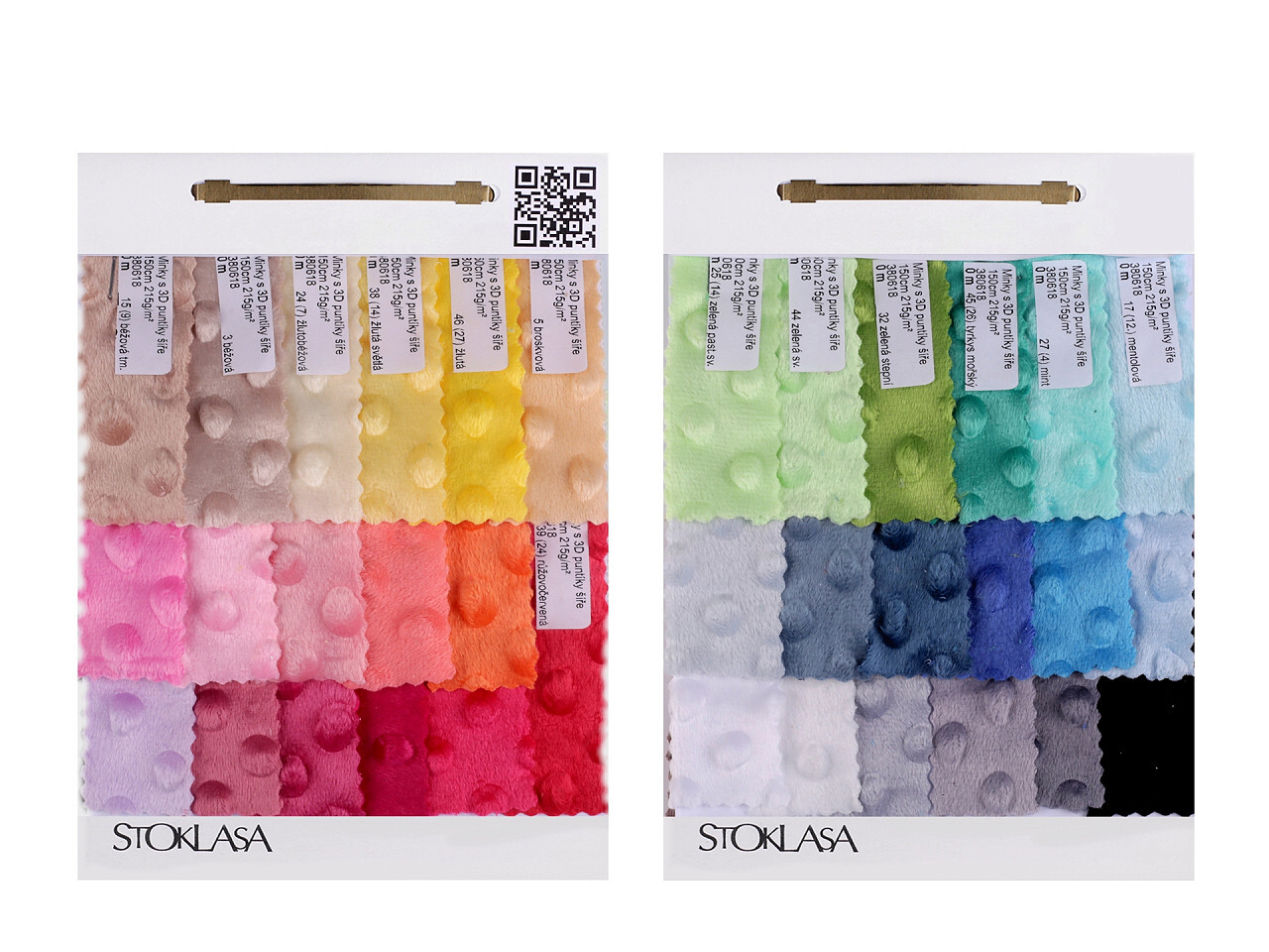 Vzorkovníky látek, které u nás najdete. Na každém vzorkovníku je QR kód, který vás po jeho načtení v aplikaci odkáže přímo na stránku konkrétní látky. QR kód vám urychlí a zpohodlní vyhledávání.