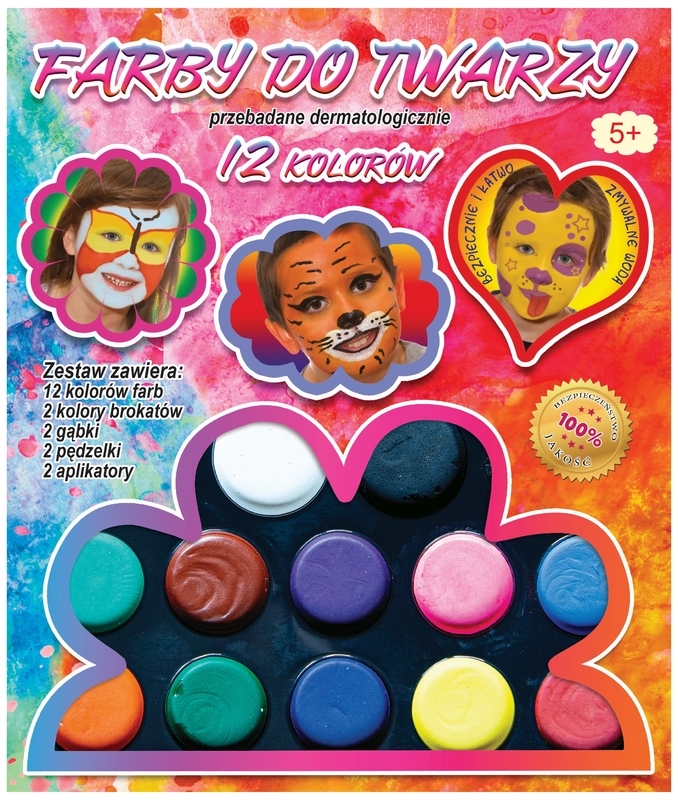 fabry do malowania twarzy, 12 kolorów+brokat+gąbka+pędziel. sp. pakowania 1/6/36 pud číst celé