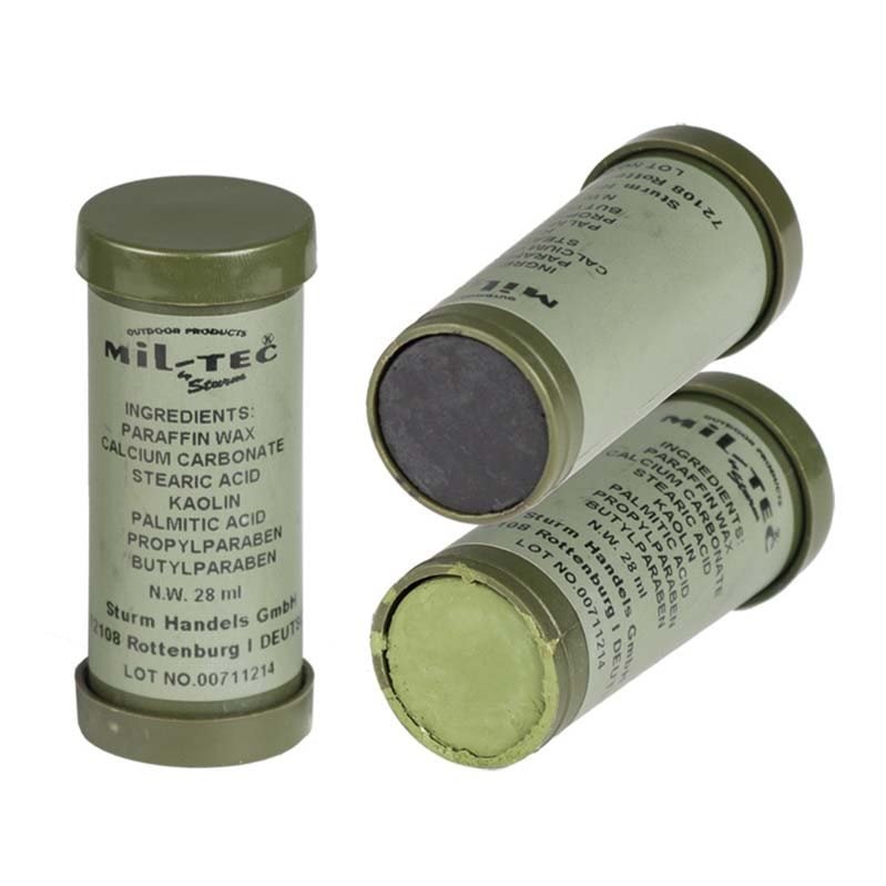 Vyzkoušejte oboustranné kamuflážní barvy v praktické tubě, které vám umožní snadno a rychle vytvořit přirozený maskovací vzhled ve dvou odstínech - zelené a černé.