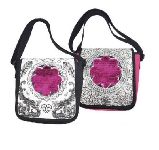 Messenger taška se třpitkami a motivem na vybarvení. Součástí 5 barevných vybarvovačů. Velikost 22X25X8cm. číst celé
