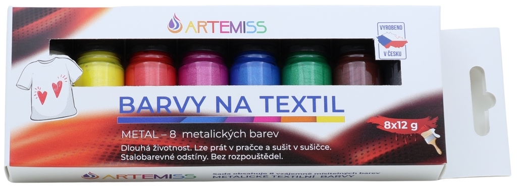 Objevte krásu a lesk textilních dekorací s metalickými barvami ARTEMISS! Tato sada 8 metalických barev je ideální pro všechny, kteří chtějí oživit své oblečení nebo doplňky unikátním kovovým leskem a zároveň si užít tvoření s dětmi i samostatně.