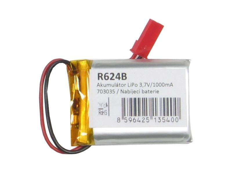 Akumulátor LiPo 3,7V/1000mAh 703035 /Nabíjecí baterie Li-Pol/. Lithium polymerová baterie s doporučeným vybíjecím proudem do 1C pro použití v powerbankách nebo zařízeních, které nevyžadují vyšší nároky na krátkodobý odběr proudu. Nevhodné pro použití v dronech, vrtulnících nebo jiných hračkách.