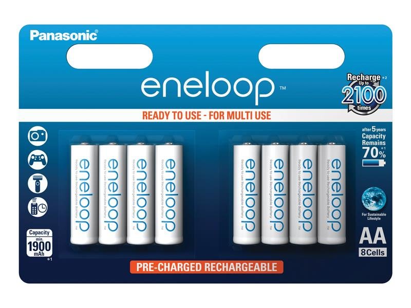 Baterie AA (R6) nabíjecí 1.2V/1900mAh Eneloop PANASONIC 8ks Eneloop AA 1900 8HH Unikátní tužkové baterie AA (R6) nově s 2100 dobíjecími cykly, které mají maximálně eliminovaný efekt samovybíjení. Díky speciální technologii udrží tyto baterie po dobu pěti let 70% své kapacity. Baterie Eneloop se dodávají v nabitém stavu a jsou připraveny k okamžitému použití.