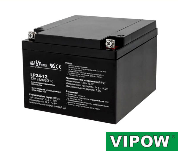 Baterie olověná 12V/24Ah VIPOW bezúdržbový akumulátor Olověné hermeticky uzavřené a zcela bezúdržbové akumulátory. Konstrukce těchto akumulátorů umožňuje libovolnou pracovní polohu. Doporučené oblasti použití: systémy UPS, záložní zdroje pro veškeré aplikace EZS a telekomunikace, záložní svítidla a nabíjecí svítilny, výstražná mobilní a signalizační zařízení apod.