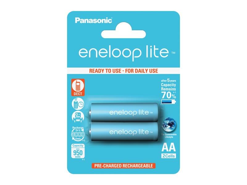 Eneloop Lite AA 950 2BP Tužkové baterie AA (R6) speciálně navržené pro DECT telefony s 3000 dobíjecími cykly a kapacitou min. 950 mAh, které mají maximálně eliminovaný efekt samovybíjení. Díky speciální technologii udrží tyto baterie po dobu pěti let až 70% své kapacity. Baterie Eneloop Lite se dodávají v nabitém stavu a jsou připraveny k okamžitému použití.