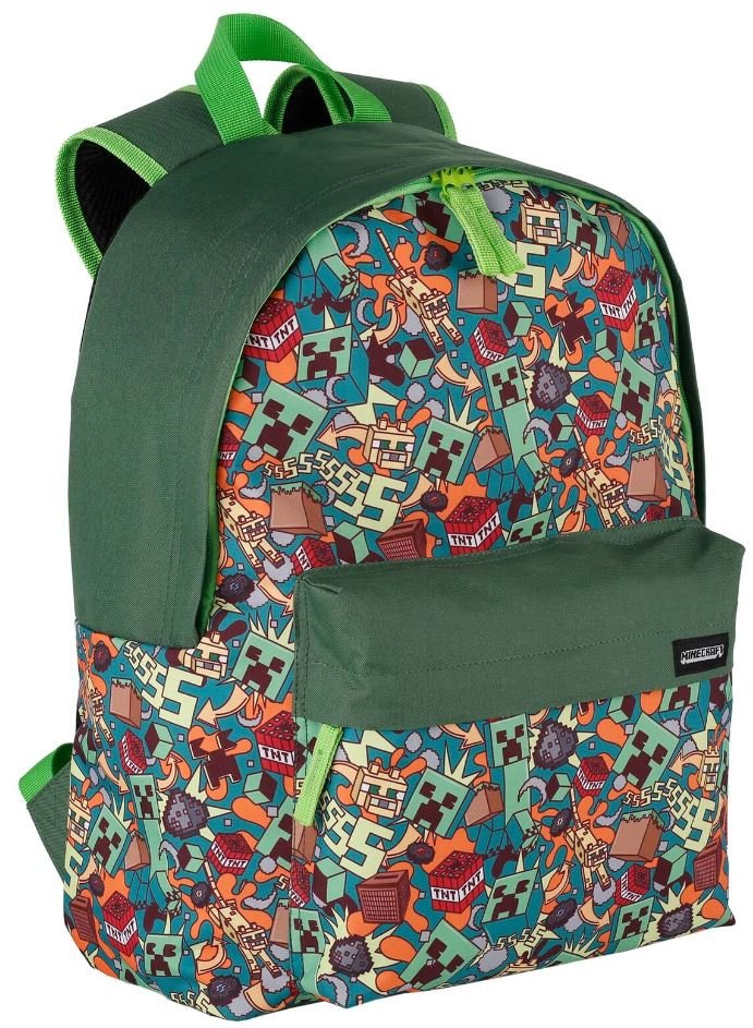 Prostorný zelený batoh vyvedený v motivu hry Minecraft. Součástí jsou ergonomicky polstrovaná záda, délkově nastavitelné ramenní popruhy a ucho pro nošení v ruce. Zapínání je na zip.