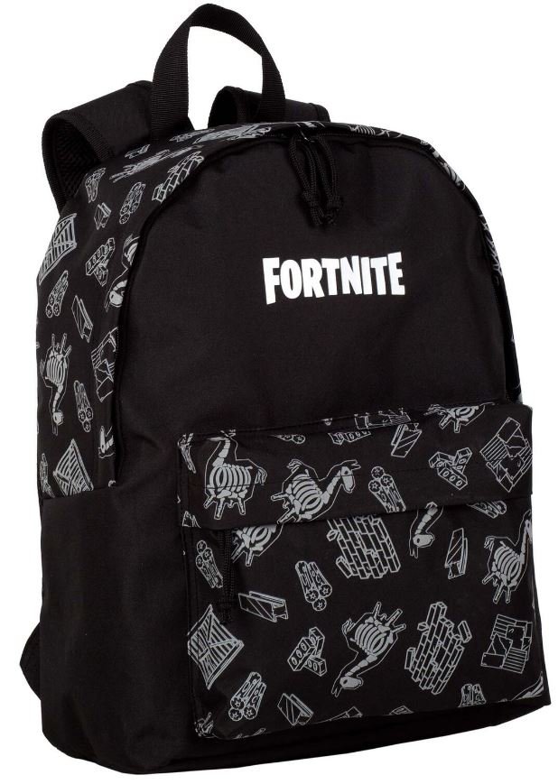 Prostorný černý batoh vyvedený v motivu hry Fortnite. Součástí jsou ergonomicky polstrovaná záda, délkově nastavitelné ramenní popruhy a ucho pro nošení v ruce. Zapínání je na zip.