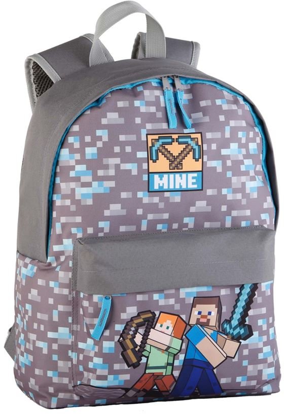 Prostorný šedý batoh vyvedený v motivu hry Minecraft. Součástí jsou ergonomicky polstrovaná záda, délkově nastavitelné ramenní popruhy a ucho pro nošení v ruce. Zapínání je na zip.