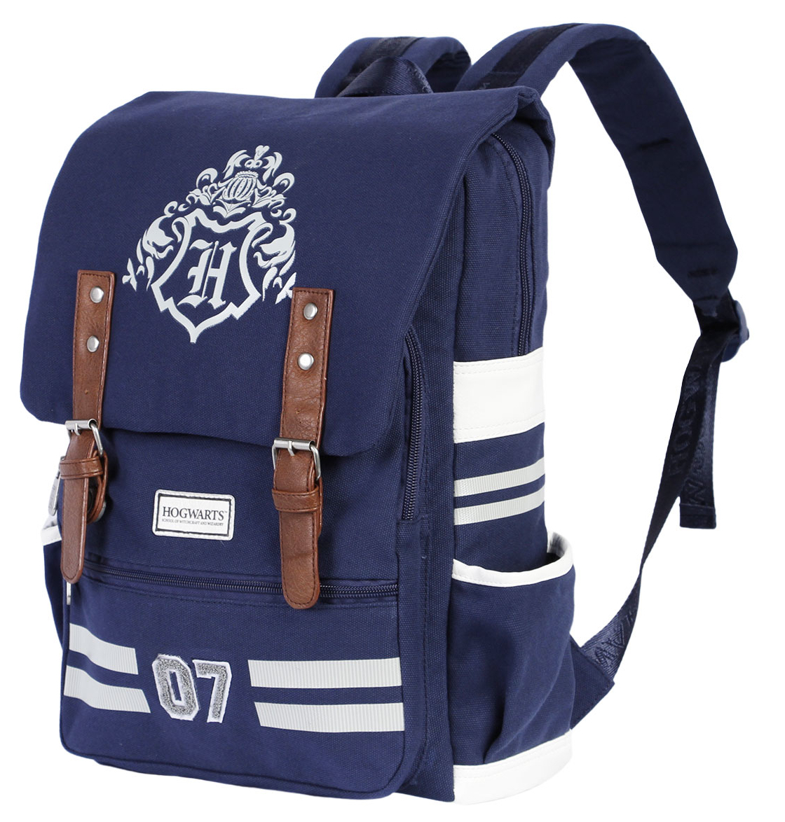 Retro batoh se dvěma přihrádkami uzavíratelnými na zip a zakrytými chlopní s proužky inspirovaný bradavickým erbem. Batoh obsahuje boční a přední kapsy plus polstrovaný vnitřní rozdělovač pro elektronická zařízení.