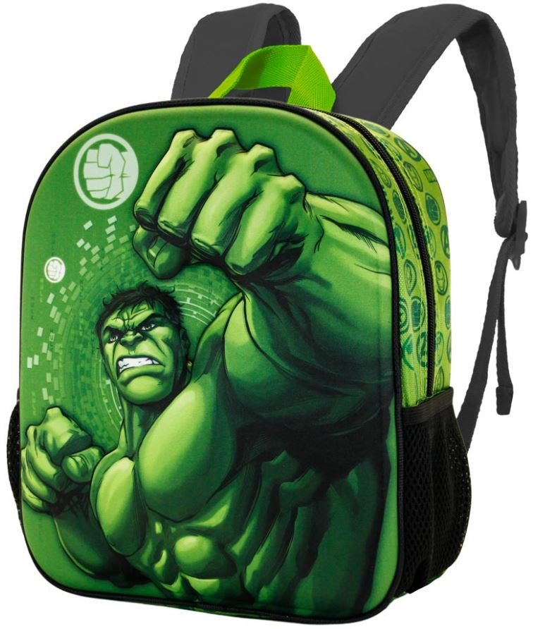 Jednoprostorový dětský zelený batoh s motivem postavy Hulk od společnosti Marvel, batoh ma delkově nastavitelné popruhy a disponuje boční kapsou na láhev.