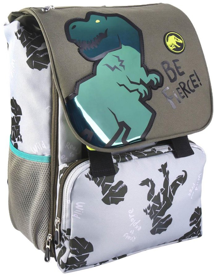 Atraktivní šedo-zelený školní batoh s přední kapsičkou, boční síťkovou kapsou na láhev a grafikou Jurassic Park (Jurský Park).