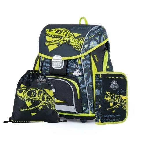 Školní set pro prvňáčka s motivem Jurského světa. Set obsahuje školní batoh Premium, sáček na cvičky a nenaplněný jednopatrový penál. Aktovka: Školní aktovka z řady Premium s motivem Jurského světa je anatomicky tvarovaná a zajišťuje tak správné usazení na zádech. Popis : Pevné dno Anatomicky tvarovaná polstrovaná záda Reflexní prvky v souladu s ČSN Polstrované nastavitelné ramenní popruhy Nastavitelný hrudní popruh Přítažný popruh Boční kapsy na láhev Přední kapsa na svačinu Na spodní části víka najdete rozvrh hodin Vhodné do 1.-3. třídy ZŠ Váha: 1 100 g Nosnost: 8 kg Objem: 20 l Rozměry: 350 x 310 x 180 mm