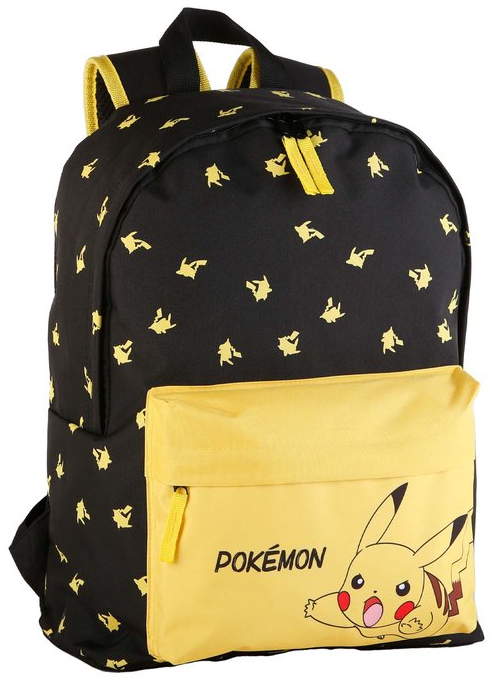 Prostorný černý batoh se žlutými prvky vyvedený v motivu pokémona Pikachu. Součástí jsou ergonomicky polstrovaná záda, délkově nastavitelné ramenní popruhy a ucho pro nošení v ruce. Zapínání je na zip.