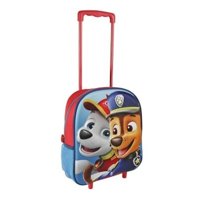 Batoh Tlapková patrola 3D červeno/modrý. S pevnými 3D zády , praktickým uchem na nošení v ruce, vysouvacím držadle, kolečky a nastavitelnými a polstorovanými popruhy, s dvěma zipy a bočními kapsami na pití.
