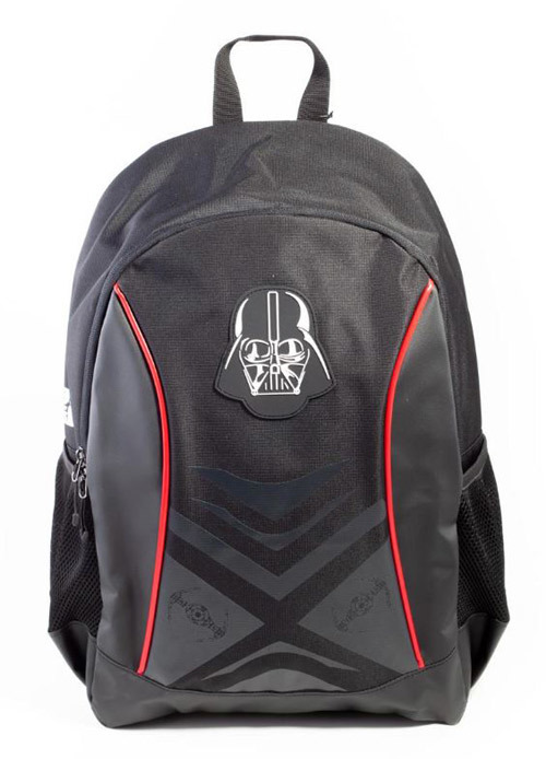 Jednoprostorový černý batoh s velkým uložným prostorem a místem na uložení laptopu, vyvedený v grafice Darth Vadera, postavy z kultovní sci-fi ságy Star Wars.