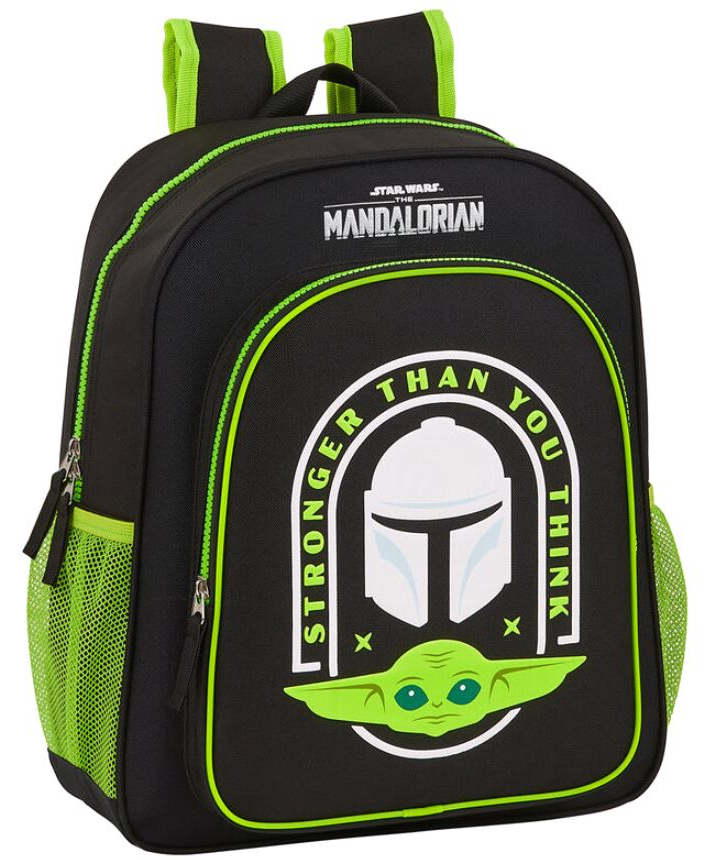 Dvouprostorový dětský černý batoh s motivem The Mandalorian na přední straně. Batoh se dvěma bočními kapsami, délkově nastavitelnými popruhy a uchem pro snadné nošení v ruce, je vhodný na každodenní využití.