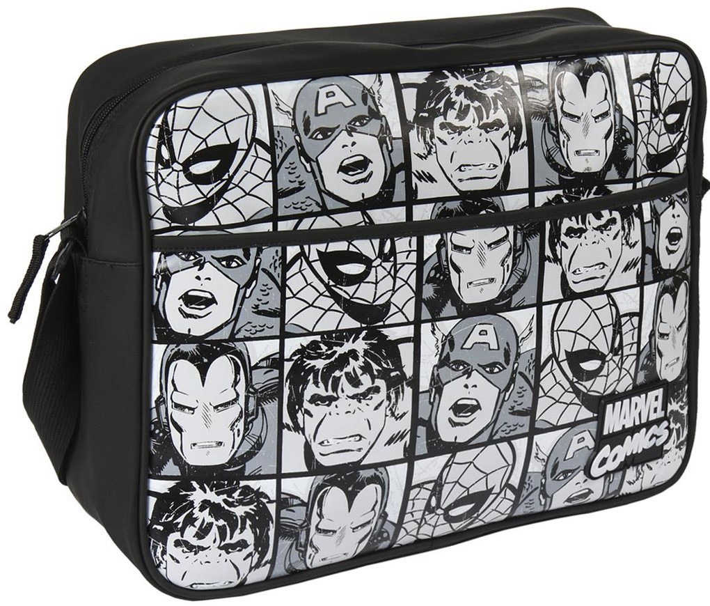Černá taška na rameno s přední kapsou a grafikou postav Avengers. Taška má délkově nastavitelný popruh a je vhodná na každodenní nošení.